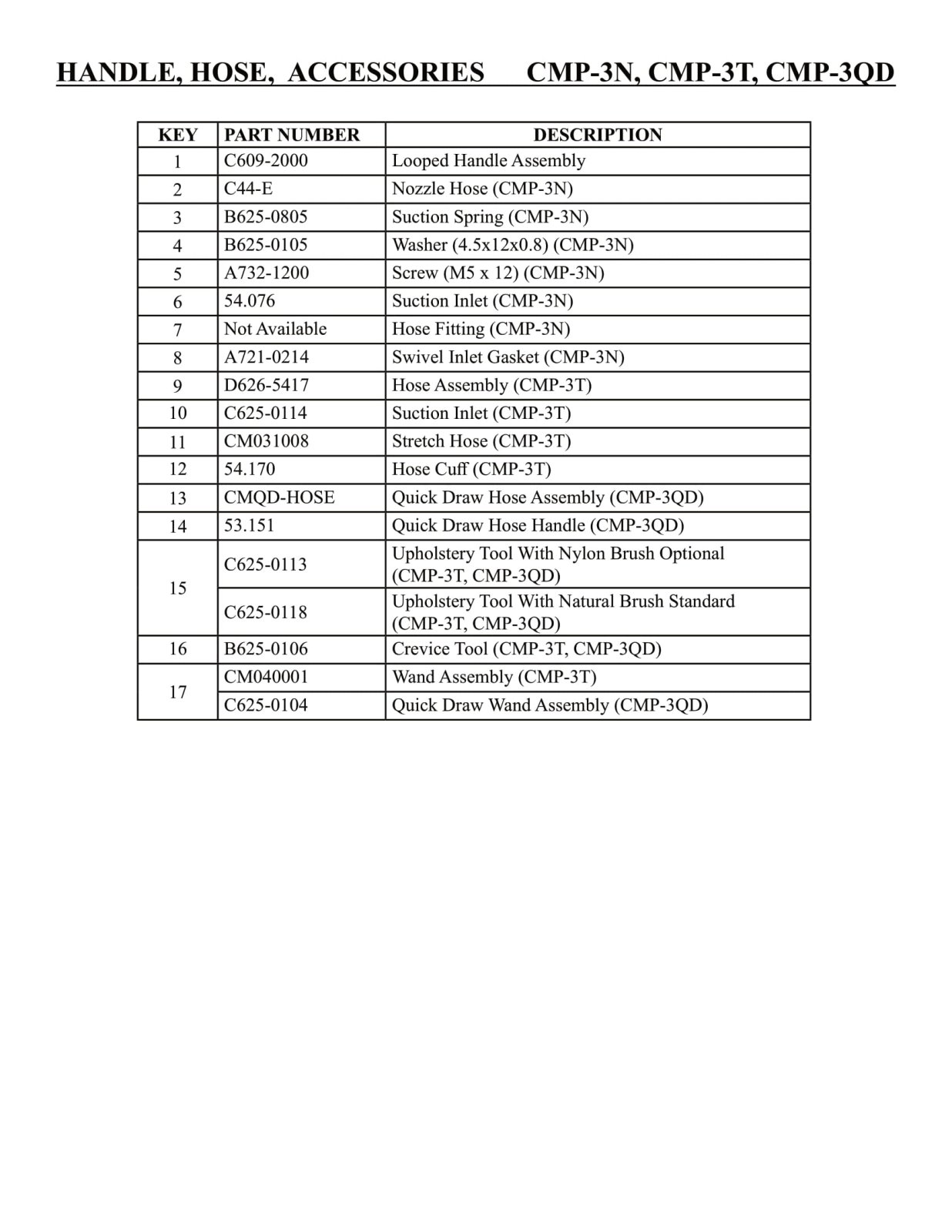 CleanMax Parts - Model CMP-3N / CMP-3T / CMP-3QD - Handle, Hose & Accessories